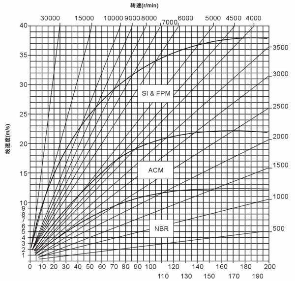在同一轴径条件下,以润滑性良好的矿物油为被密封的介质,并利于散热及无压(不超过0.05Mpa)工况时,用不同的橡胶材质制造的油封,其充许旋转轴的转速和线转度。